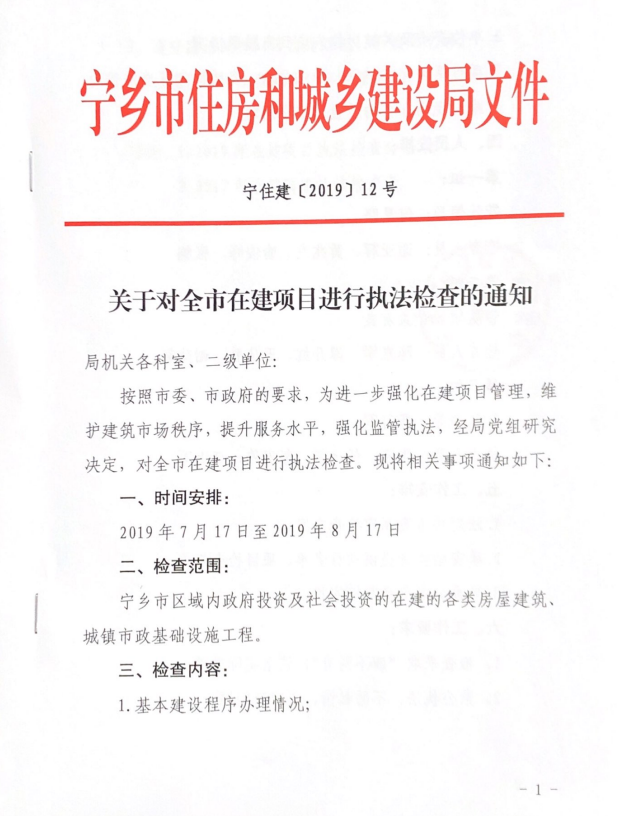 《關于對全市在建項目進行執法檢查的通知》(寧住建[2019]12號