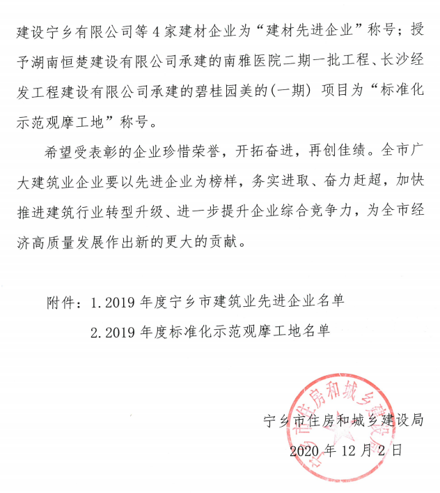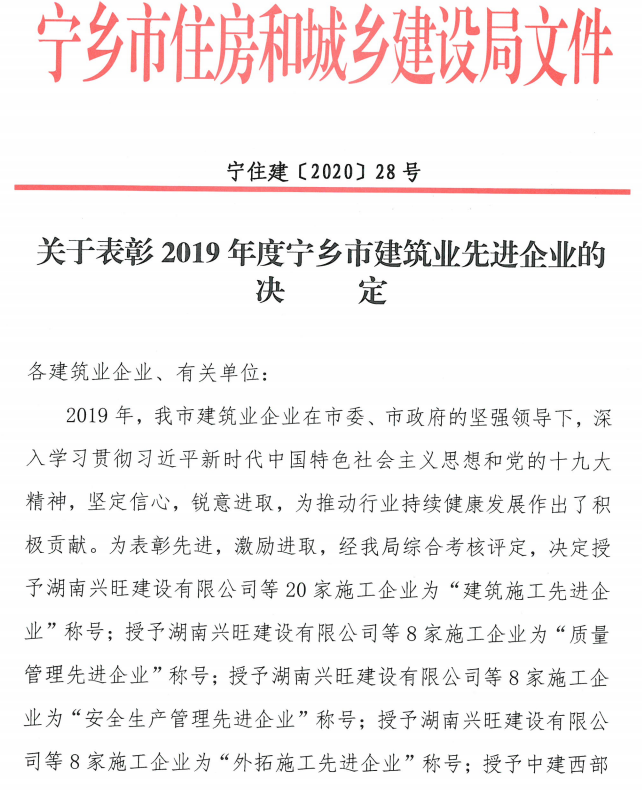 關于表彰2019年度寧鄉(xiāng)市建筑業(yè)先進企業(yè)的決定